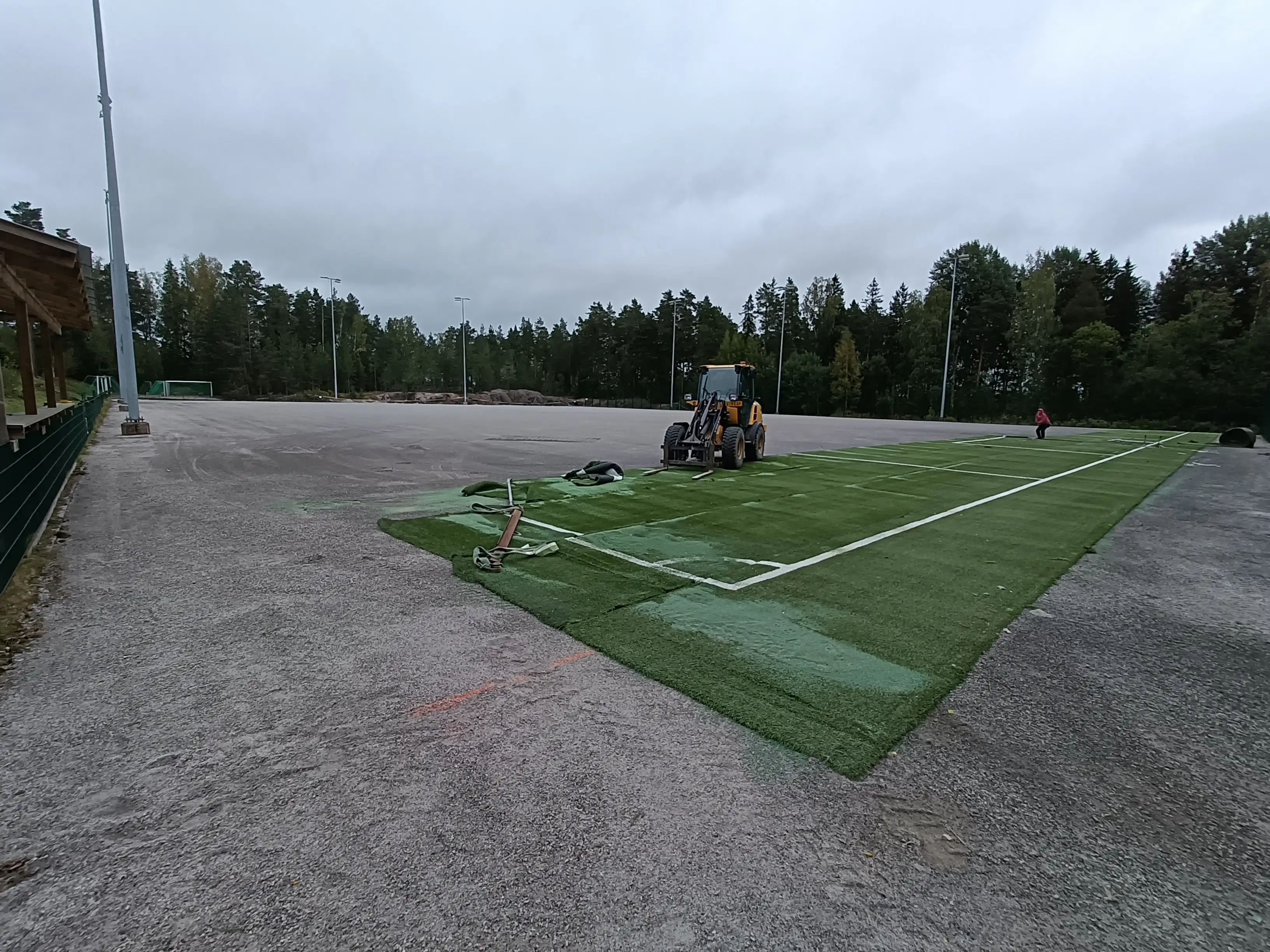 - Vanhan purku, pohjan tasoitus, siirtonurmen asennus täyteaineineen, saumojen liimaus, 8v8 rajojen maalaus