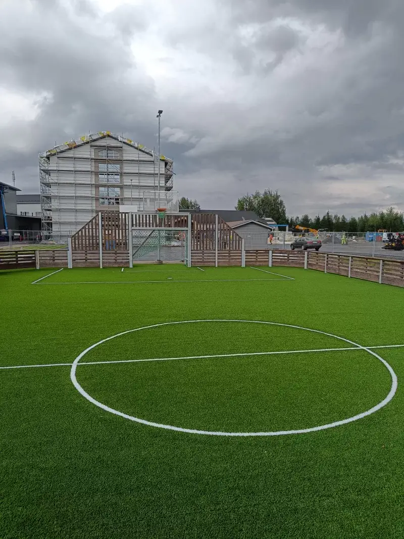 Hiekkatekonurmen asennus Kuusamossa — 1 600 m² kahteen monitoimiareenaan ja juoksusuoraan.